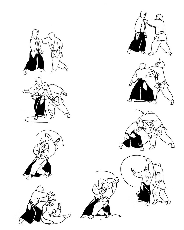 El aikidoka evita el choque, absorbe el ataque y deja pasar al atacante. Se espera que no aplique una luxación de buenas a primeras ni provoque un daño conscientemente. Además, ante varios atacantes, interesa desviar los distintos ataques, evitando las inmovilizaciones.