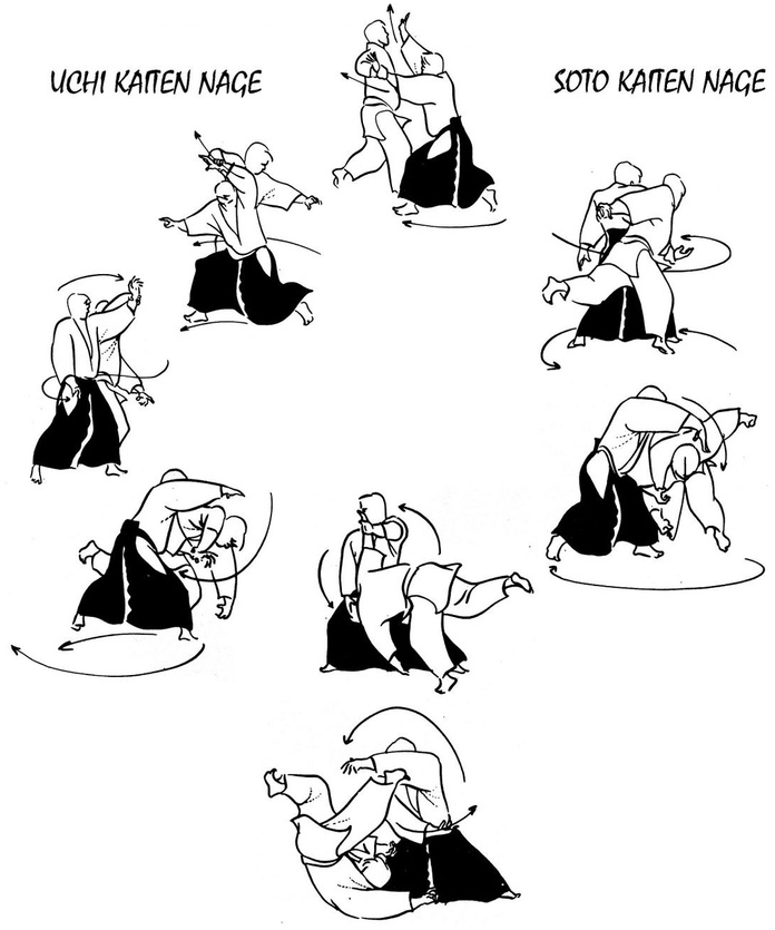 Proyección controlando la nuca de uke y uno de sus brazos. Existen dos variantes en kaiten nage: soto (exterior) y uchi (interior), que se diferencian en el modo de iniciar la técnica; en uchi se realiza una entrada interior (por debajo del brazo de uke).